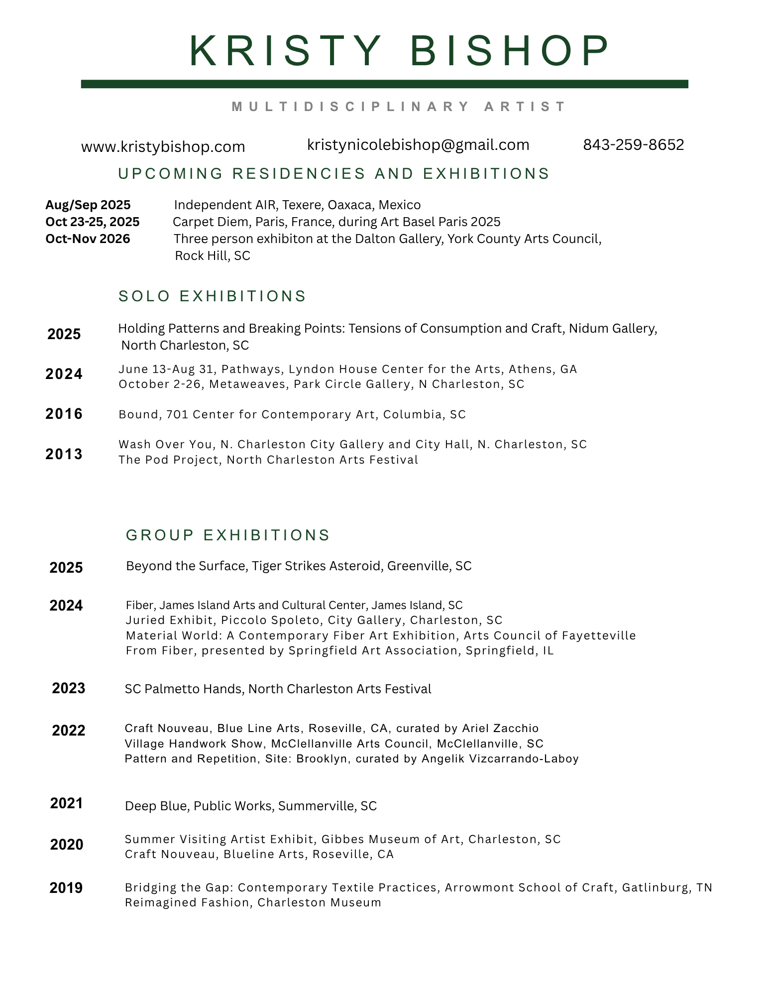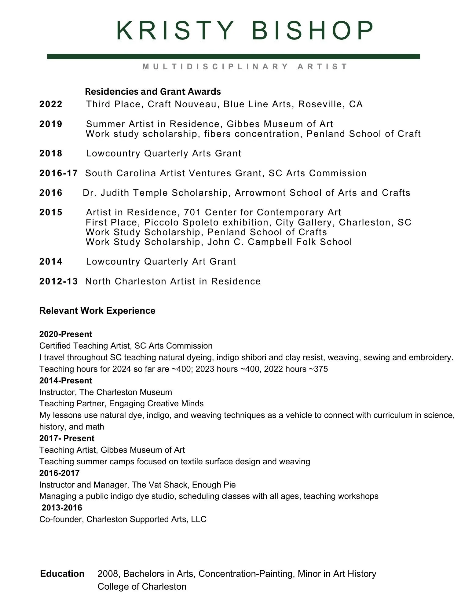 Kristy is a teaching artist focusing on textile practices. She travels for artist residencies in public schools all over South Carolina, hosts adult workshops, and summer camps. Kristy partners with Engaging Creative Minds, the Charleston Museum, McClellanville Arts Council, and the Gibbes Museum of Art to facilitate workshops. In August of 2019, Kristy was the artist-in-residence at the Gibbes Museum of Art where she focused on large-scale weaving. During the fall of 2015, Kristy participated in a three-month residency at 701 Center for Contemporary Art concluding with the solo exhibition, Bound. In 2016, Kristy was awarded the South Carolina Artists’ Ventures Initiative (AVI) Grant to expand her studio practice. She was the 2012-2013 Artist-in-Residence for the City of North Charleston. Since 2020, Kristy Bishop has been a Certified Teaching Artist through the South Carolina Arts Commission. In August she is participating in artist residency at Texere in Oaxaca Mexico and will be an exhibitor for Carpet Diem Paris this October during Art Basel Paris.