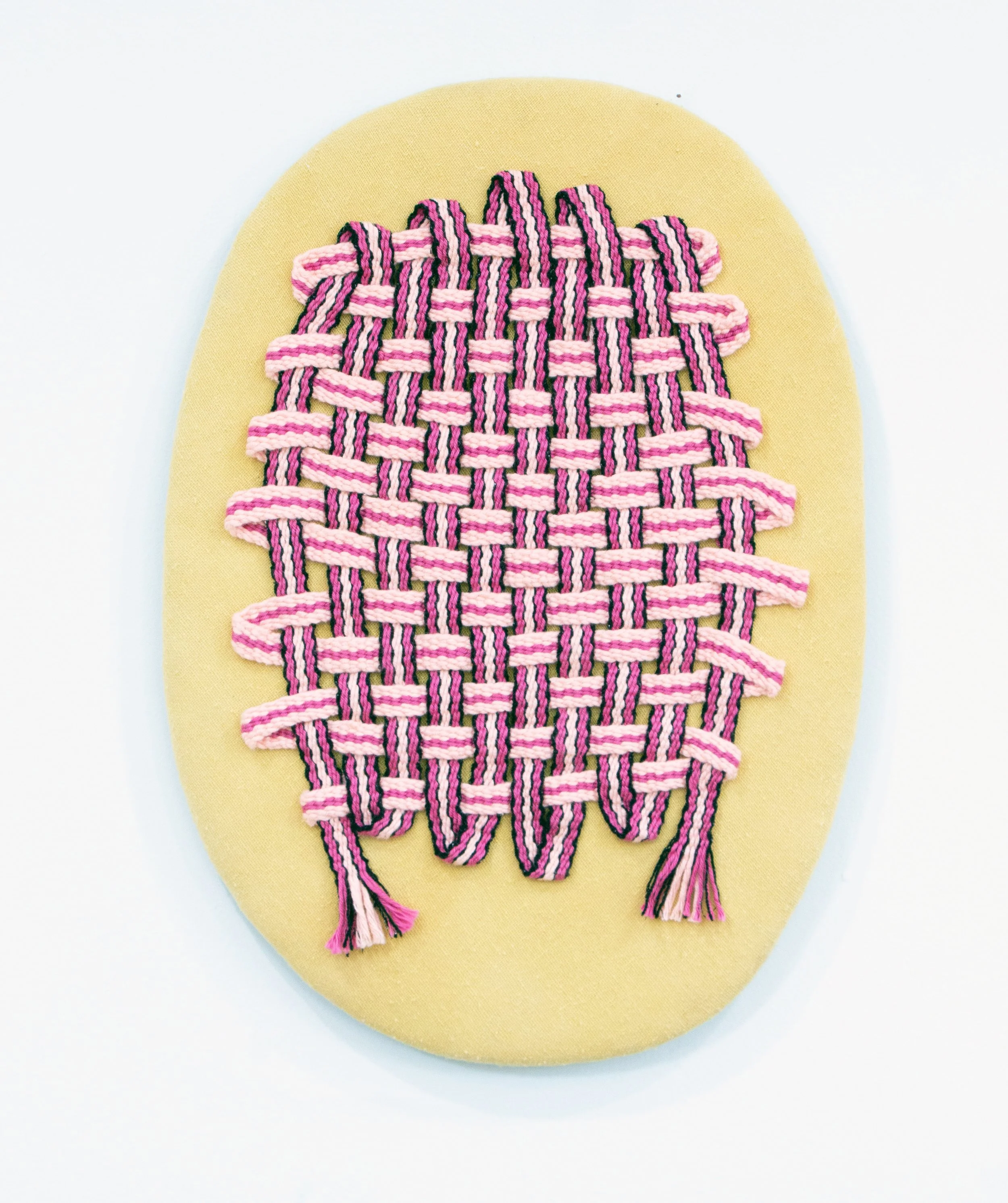 The inkle woven patterned bands criss cross and grow in an organic way like a mass of vines. Harkening back to the color choices of an earthy 1970s palate draws attention to the fact that we are no closer to living within the limits of Earth’s natural systems.